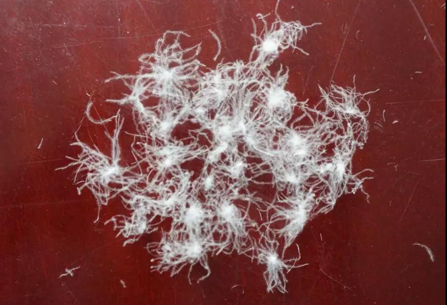 ▲羽絨金網(wǎng)在市場(chǎng)上獲得的“膠水絨”樣品,從外觀來(lái)看,“膠水絨”沒(méi)有羽絨的自然形態(tài),大多粘連在一起,容易粘附在袋子、蓬松儀側(cè)壁上,“膠水絨”檢測(cè)時(shí)蓬松度符合標(biāo)準(zhǔn)很大程度是這個(gè)原因:粘附在容器壁上的“膠水絨”阻礙了鋁質(zhì)壓板的下沉。